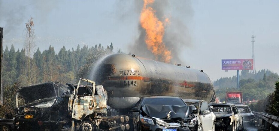 12月19日,沪蓉高速四川成南苍山段因大雾致连环追尾,一辆23吨级液化气槽车发生泄漏爆燃。