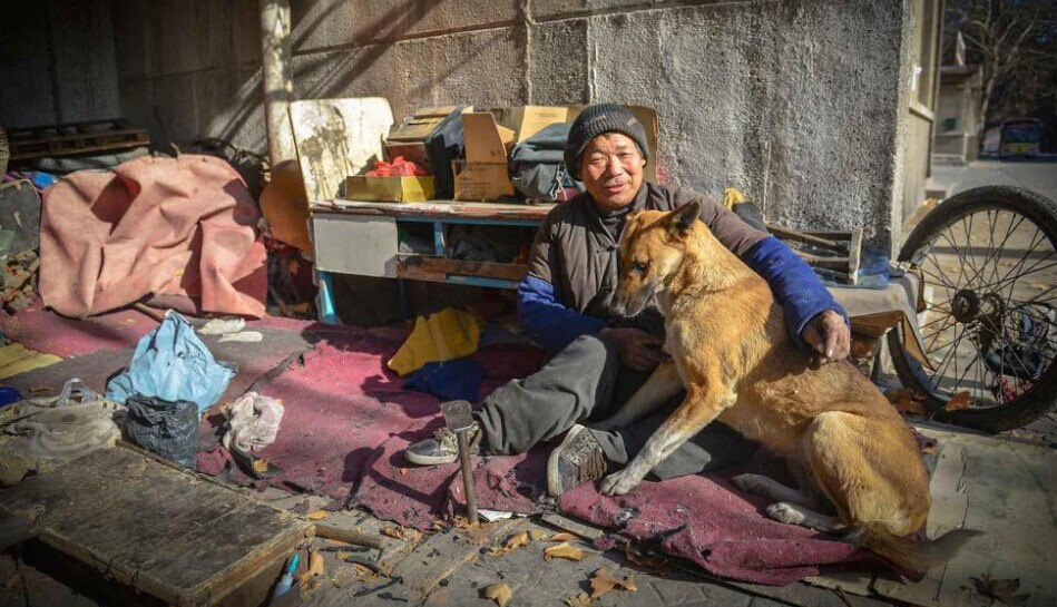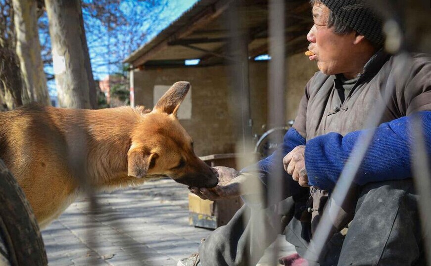 街坊们都说,老马的狗通人性,很多人都知道它。它不但会给老马看摊儿,天冷了还会给老马暖脚。老马用轮子“走路”,上坡很吃力,它就在背后使劲用前爪推老马,助他一臂之力。大黄狗奋力推老马的场景,街坊们几乎每天都能看到。