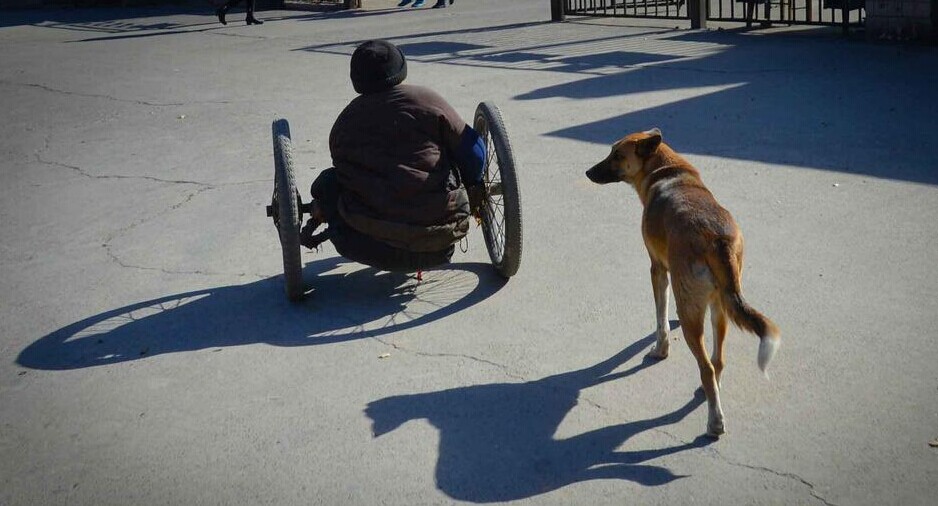 12月25日,河南洛阳,修鞋师傅老马下肢瘫痪,从家到修鞋摊一公里左右,为了代步,他用架子车轮子当交通工具,来回于修鞋摊和家之间,要用去一个多小时。一条大黄狗形影不离,在上坡时会帮助用一只手挪动架子的主人老马,这一幕发生在河南洛阳廛河区杨文办事处一工厂的门口。