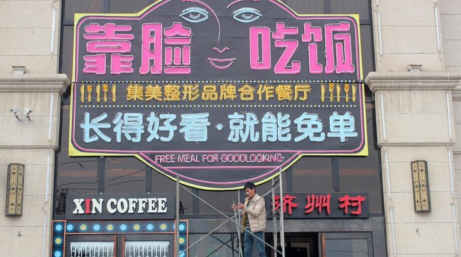 近日,郑州一餐厅因高调打出“靠脸吃饭”招牌,整形专家现场对就餐顾客容貌打分,颜值高的顾客可免费就餐活动而走火。然而,1月13日下午,该餐厅约30平方米的“靠脸吃饭”广告牌被市城管局责令自行拆除。郑州市城市管理局下发的责令改正通知书中显示,该餐厅未经批准,擅自设置户外广告行为,违反《郑州市户外广告设置管理条例》第12条规定,有碍市容容貌。不过,餐厅薛经理表示,“脸庞”虽被摘除,但“刷脸”活动将依旧进行。图为餐厅“靠脸吃饭”招牌因有碍市容市貌被拆除。