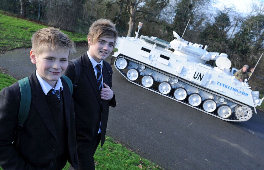 2014年12月17日报道(具体拍摄日期不详),一名父亲发明了一个让自己的两个儿子不管刮风下雨,每天按时上学的好办法—每天驾驶一辆重达17吨的坦克送他们上学。