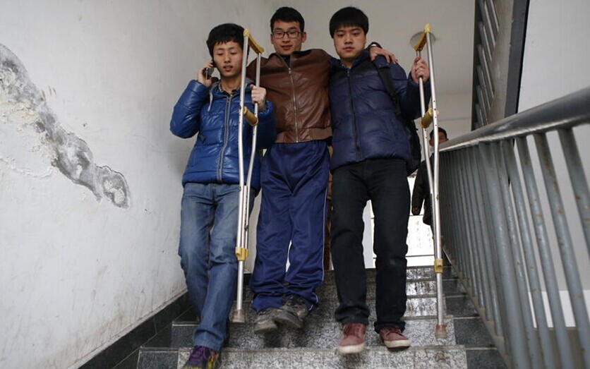 2014年12月23日消息,陕西咸阳,“病魔虽然夺去了我的健康,上天却赐予了我一群好舍友。”双腿残疾无法行走,生活对于咸阳师范学院大三学生田亚峰来说无疑是残酷的,但他又是幸运的,因为每当他要上楼下楼时,5个舍友的肩膀总会及时挺出,两年多来风雨无阻。图为中午,田亚峰的室友们带着他到食堂吃饭。