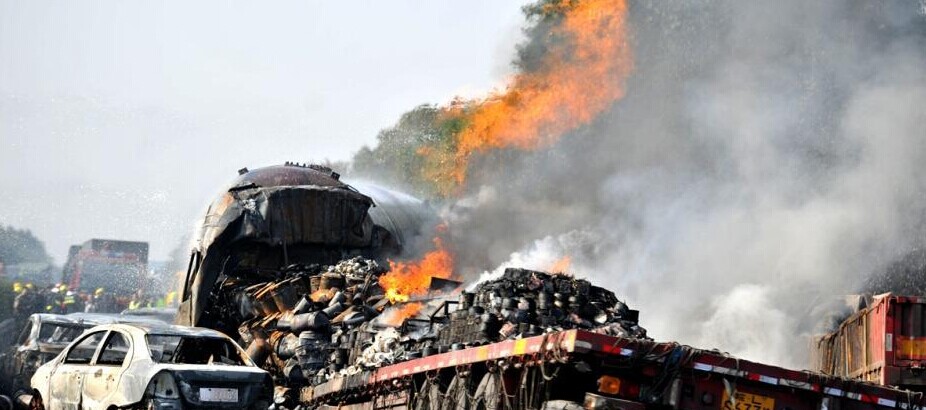 高速路液化气罐车追尾后爆燃 致6死多伤