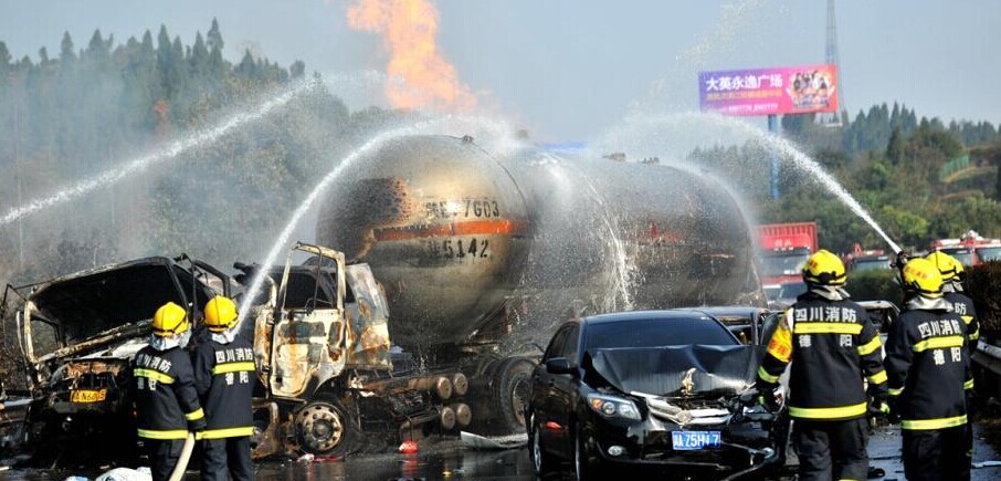 12月19日,沪蓉高速四川成南苍山段因大雾致连环追尾,一辆23吨级液化气槽车发生泄漏爆燃。