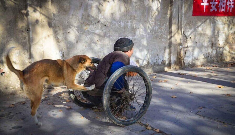 街坊们都说,老马的狗通人性,很多人都知道它。它不但会给老马看摊儿,天冷了还会给老马暖脚。老马用轮子“走路”,上坡很吃力,它就在背后使劲用前爪推老马,助他一臂之力。大黄狗奋力推老马的场景,街坊们几乎每天都能看到。