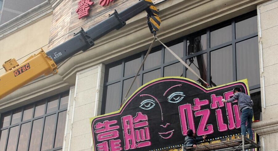 近日,郑州一餐厅因高调打出“靠脸吃饭”招牌,整形专家现场对就餐顾客容貌打分,颜值高的顾客可免费就餐活动而走火。然而,1月13日下午,该餐厅约30平方米的“靠脸吃饭”广告牌被市城管局责令自行拆除。郑州市城市管理局下发的责令改正通知书中显示,该餐厅未经批准,擅自设置户外广告行为,违反《郑州市户外广告设置管理条例》第12条规定,有碍市容容貌。不过,餐厅薛经理表示,“脸庞”虽被摘除,但“刷脸”活动将依旧进行。图为餐厅“靠脸吃饭”招牌因有碍市容市貌被拆除。