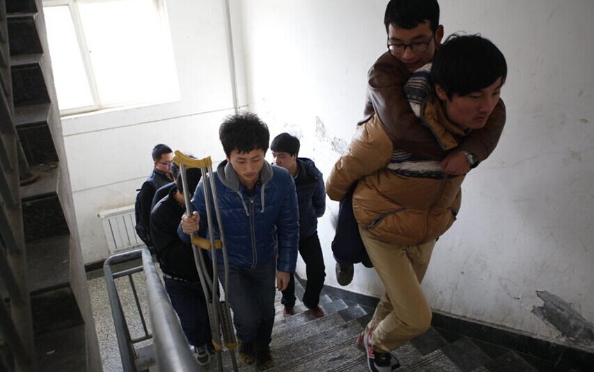 5男生背残疾舍友上课 两年多风雨无阻